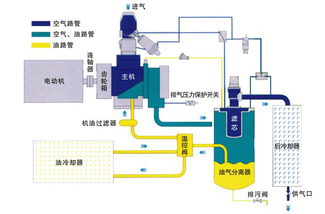 螺桿式空壓機的工作過程如下圖: