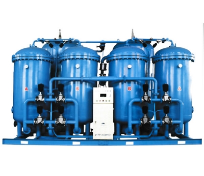 由于碳分子篩對氧的吸附容易隨壓力的不同兩者有明顯差異,降低壓力,即可解吸碳分子篩吸附的氧分子,使碳分子篩再生,得以重復循環(huán)使用。采用兩個吸附干塔流程,一塔吸附產(chǎn)氮,一塔解吸再生,通過PLC程序控制氣動閥的啟閉,使兩塔循環(huán)交替,連續(xù)產(chǎn)出高品質(zhì)氮氣。